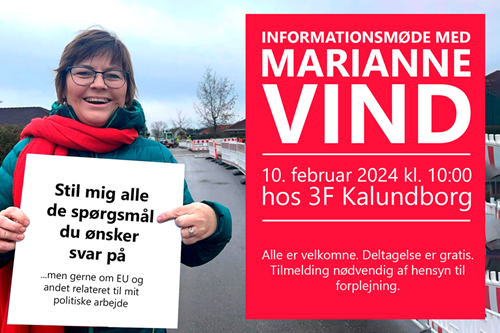 Informationsmøde med Marianne Vind Du inviteres til et spændende arrangement, hvor vi bl.a. skal tale om arbejdsmarkedspolitiske forhold og høre om Mariannes interessante arbejde i EU Du har mulighed for at stille Marianne spørgsmål, så du får klar besked inden EU-valget senere på året. Arrangementet er gratis men kræver tilmelding pga. forplejning.